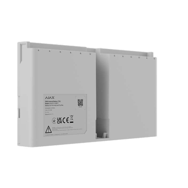 Uppladdningsbart internt batterier (Li-ion) avseddt för EN54 Fire Hub Jeweller och EN54 Fire ReX Jeweller säkerställer systemets autonoma drift vid strömavbrott. Batterierna garanterar oavbruten prestanda hos Ajax brandskyddssystem i kritiska situationer i enlighet med EN54-4-standarden.